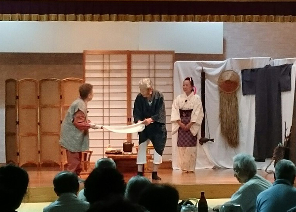 また、寸劇の背景は地域のボランティアに描いてもらい、衣装や小道具は、各自で持ち寄ったり作成したりするなど、手づくりで寸劇を作り上げている。
